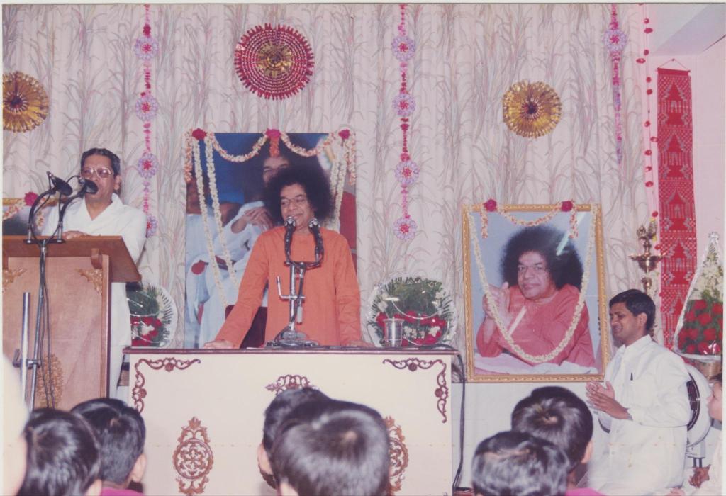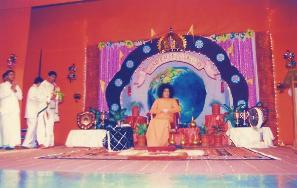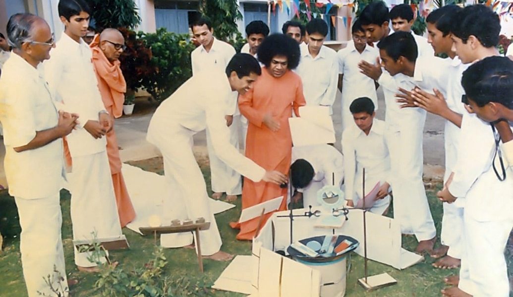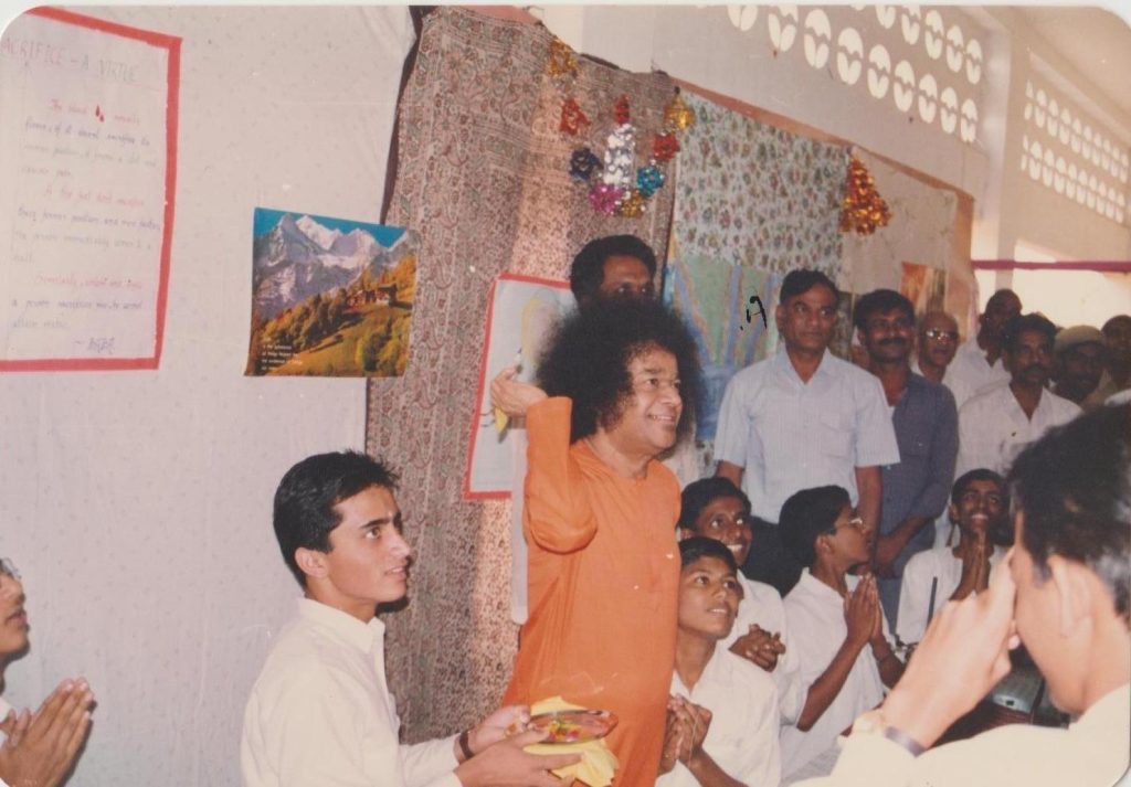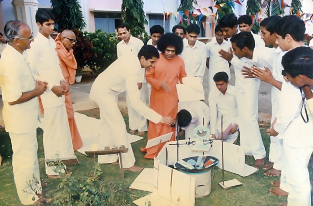 Once, the backdrop had a globe. Swami noticed that this globe was slowly rotating. When He asked how it was moving, the boys showed him a small table fan, discreetly placed at an angle. Swami smiled and remarked humorously, “I thought that fan was meant for me!” His gentle humour filled the hall with joy.