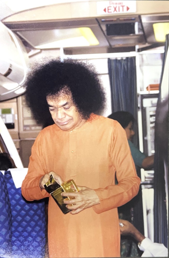 During a chartered flight from Bangalore to Madurai, after everyone had settled, Swami got up and distributed gold coin chocolates.