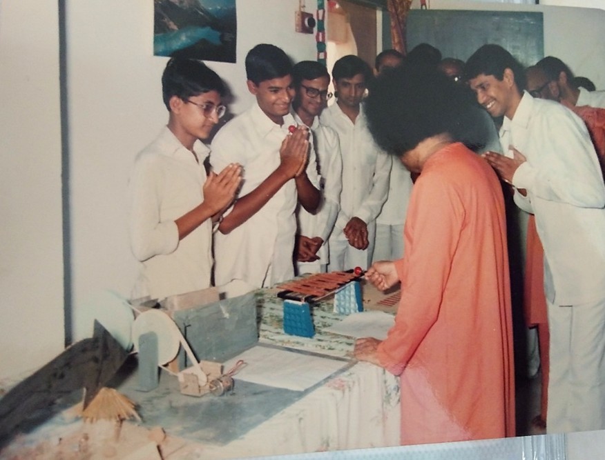 In one of the rooms, a student had displayed a burglar alarm model. When Swami came to the boy, he explained that the alarm beeps if an object is removed. Then demonstrated the same. He then humbly invited Swami to try it. When Swami lifted the object, there was no sound.